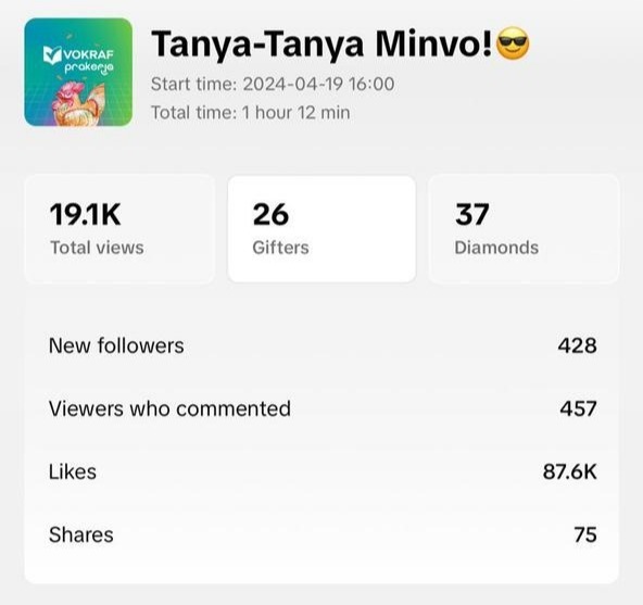During the "Tanya-Tanya Minvo!" live session on April 19, 2024, I attracted 19.1K viewers, generated 457 comments, 87.6K likes, and gained 428 new followers. The session was shared 75 times and discovered by 99% of viewers through suggested LIVE videos, showcasing my ability to captivate and grow the audience effectively.